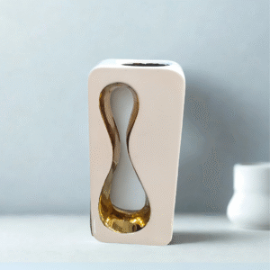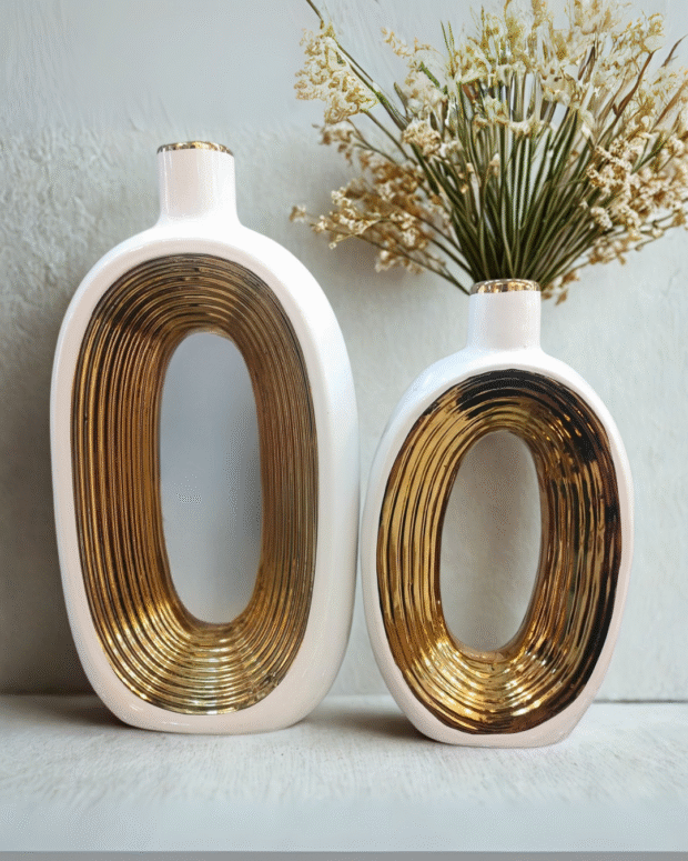 ⚪️✨ Set of two white ceramic vases with a gleaming gold interior 🌟 Unique elliptical cut-out design for a modern, artistic look 🏡 Ideal for side tables, shelves, or as a centerpiece in contemporary spaces 🎁 A chic and thoughtful gift for housewarmings, weddings, or any decor lover