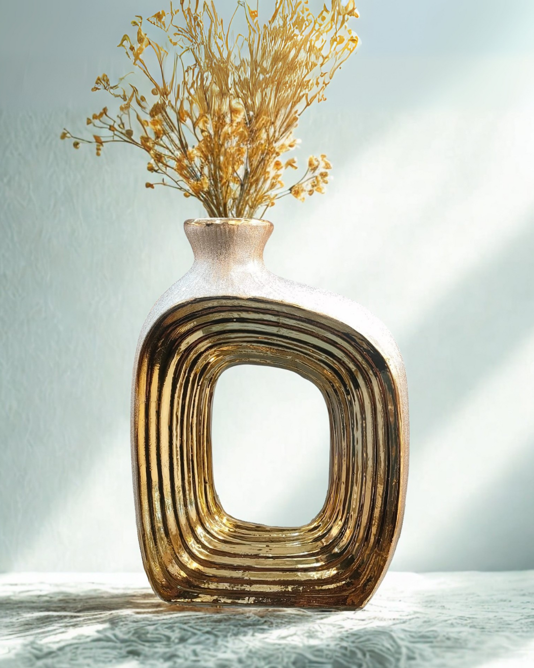 A modern masterpiece of form and light. This unique vase, with its shimmering golden finish and striking hollow core, is designed to be a captivating focal point. The dynamic, undulating lines create a sense of flow and movement, while the textured surface catches the light beautifully, adding a touch of contemporary elegance to any space. It’s the perfect home for dried florals or a standalone statement piece.