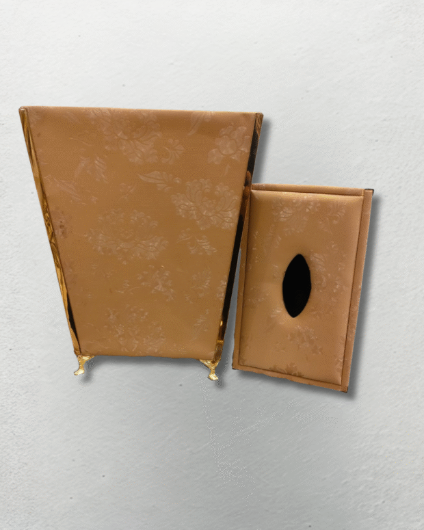 ⚜️ Warm golden-tan fabric with a delicate embossed floral pattern ✨ Elegant gold trim and charming golden feet on the waste bin 🏡 Ideal for adding a warm, sophisticated, and tranquil touch to any room 🎁 A thoughtful and beautiful gift for housewarmings, weddings, or anyone who appreciates classic, refined decor