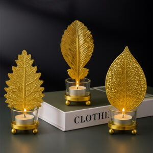 Metal Golden Leaf Decor Candle Holder with Free LED Candle