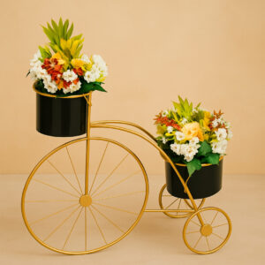 Infuse your space with modern sophistication using this stunning planter. A vibrant green plant nestled within a sleek black pot is encased in an eye-catching gold geometric cage, all resting elegantly on a “CHANEL” coffee table book. It’s a perfect blend of natural beauty and contemporary design.