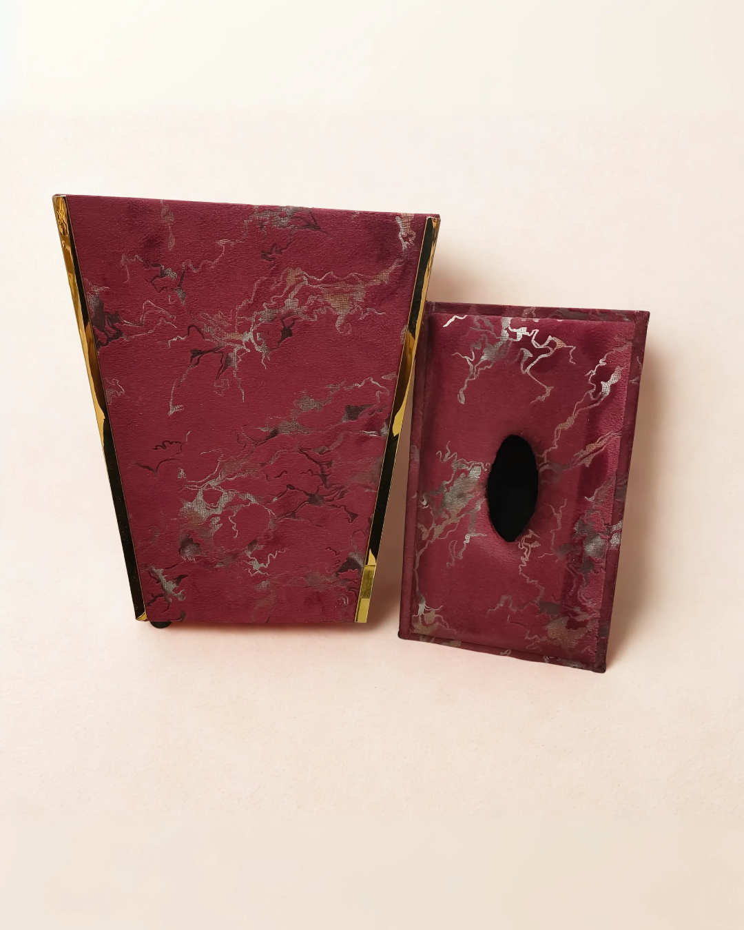 Indulge in a touch of bold elegance with our Crimson Veins Waste Bin & Tissue Box Set. This striking duo features a rich, deep crimson fabric beautifully adorned with an intricate, swirling silver or platinum-toned pattern, creating a luxurious marble-like effect. Each piece is meticulously finished with sleek golden trim, providing a sophisticated contrast that enhances their opulent appeal. Perfect for adding a dramatic pop of color and refined texture to your bedroom, study, or any space desiring a statement of luxury.