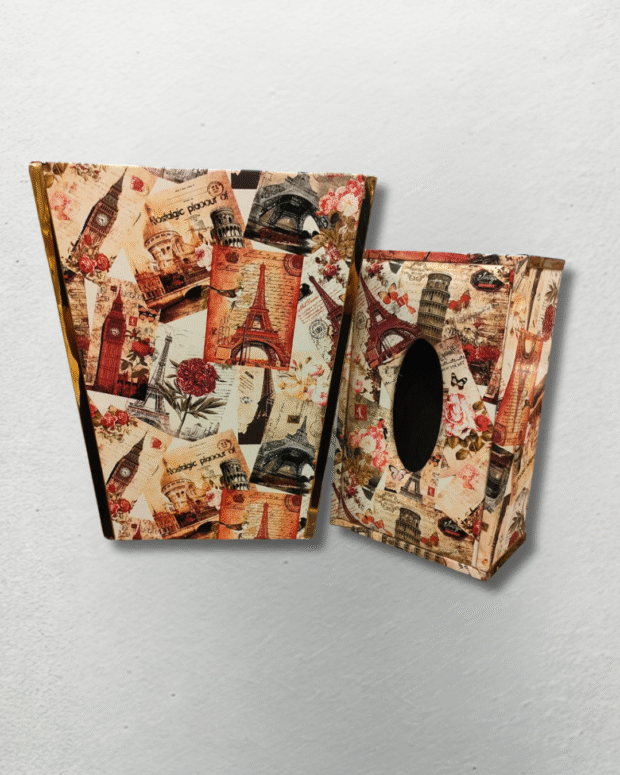 Immerse your space in the romantic charm of travel with our Romantic Escapes Waste Bin & Tissue Box Set. This enchanting duo features a collage-style pattern of vintage postcards, showcasing iconic European landmarks like the Eiffel Tower, Big Ben, and the Leaning Tower of Pisa, all beautifully intertwined with delicate floral accents. Each piece is framed with sleek golden trim, adding a touch of sophisticated allure to its whimsical design. Perfect for infusing a sense of wanderlust, nostalgia, and artistic flair into your study, bedroom, or living room.