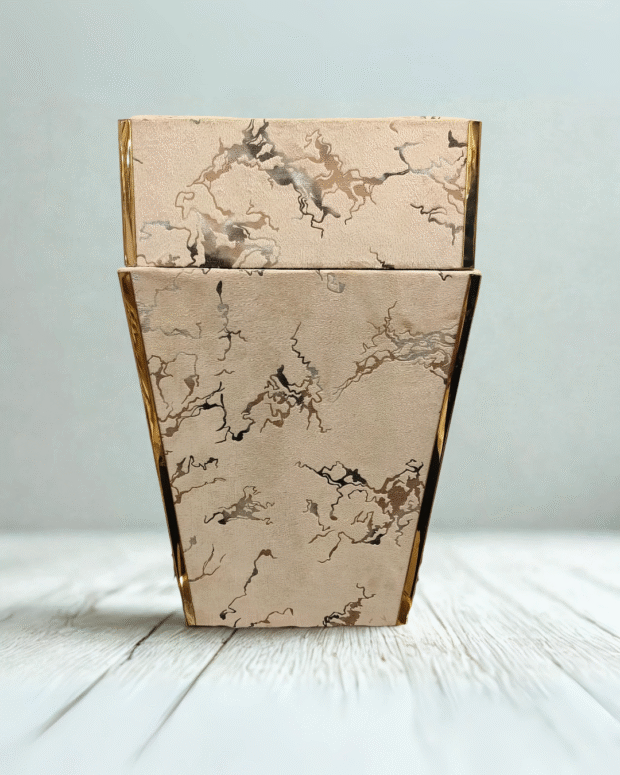 Introduce an air of serene sophistication with our Ethereal Marble Waste Bin & Tissue Box Set. This captivating duo features a delicate cream-beige fabric elegantly swirled with subtle grey, warm gold, and dark accents, creating a nuanced, natural marble effect. Each piece is beautifully framed with polished golden trim, adding a touch of understated luxury to their artful design. Perfect for enhancing the tranquility of your bedroom, adding refinement to an office, or bringing gentle elegance to any living space.