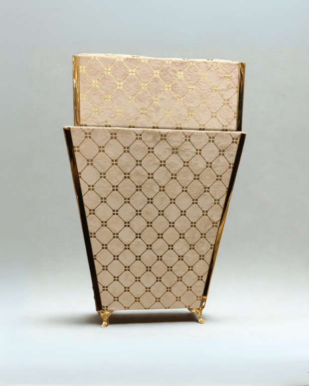 🌟 Soft cream-beige fabric with an elegant golden lattice pattern ✨ Polished gold trim and charming golden feet on the waste bin 🏡 Ideal for adding a warm, sophisticated, and light touch to any room 🎁 A thoughtful and practical gift for housewarmings or anyone who appreciates classic, refined decor