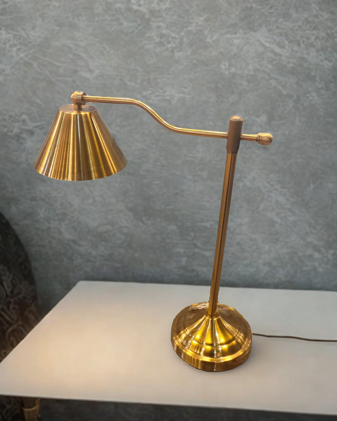 Illuminate your tasks with the functional elegance of this stylish golden desk lamp. Its classic bell-shaped shade is positioned on an adjustable arm, allowing you to direct light precisely where needed. The gleaming gold finish throughout, from the sturdy base to the elegant arm, exudes a timeless sophistication, perfect for a home office, study, or any reading nook.