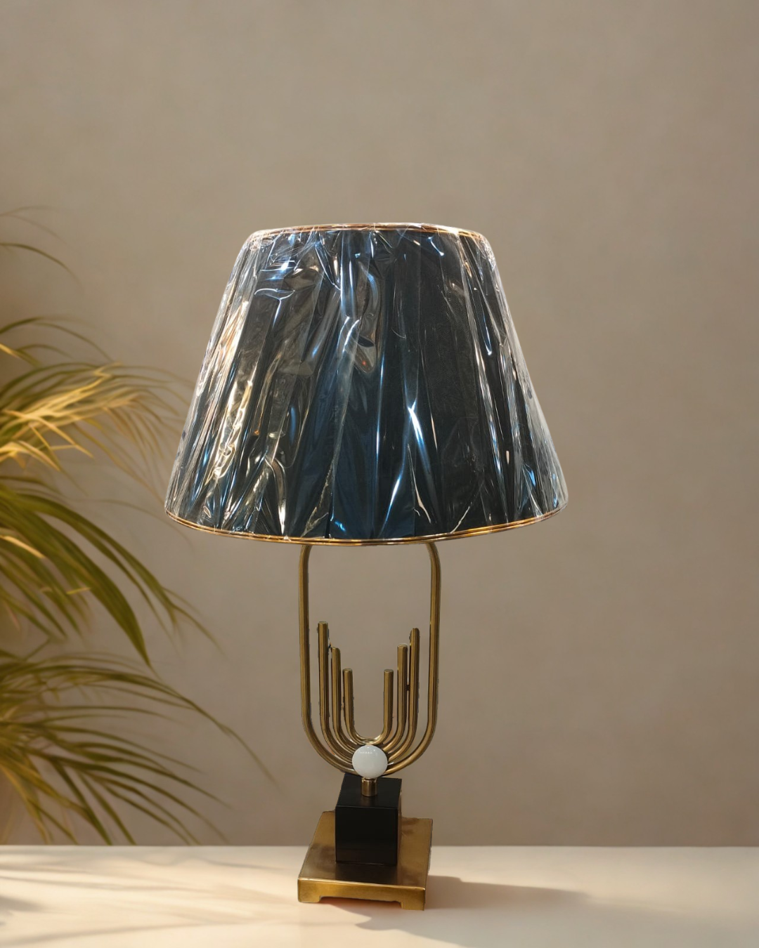 - Table lamp with a geometric golden base, black pedestal, and classic black pleated shade.
