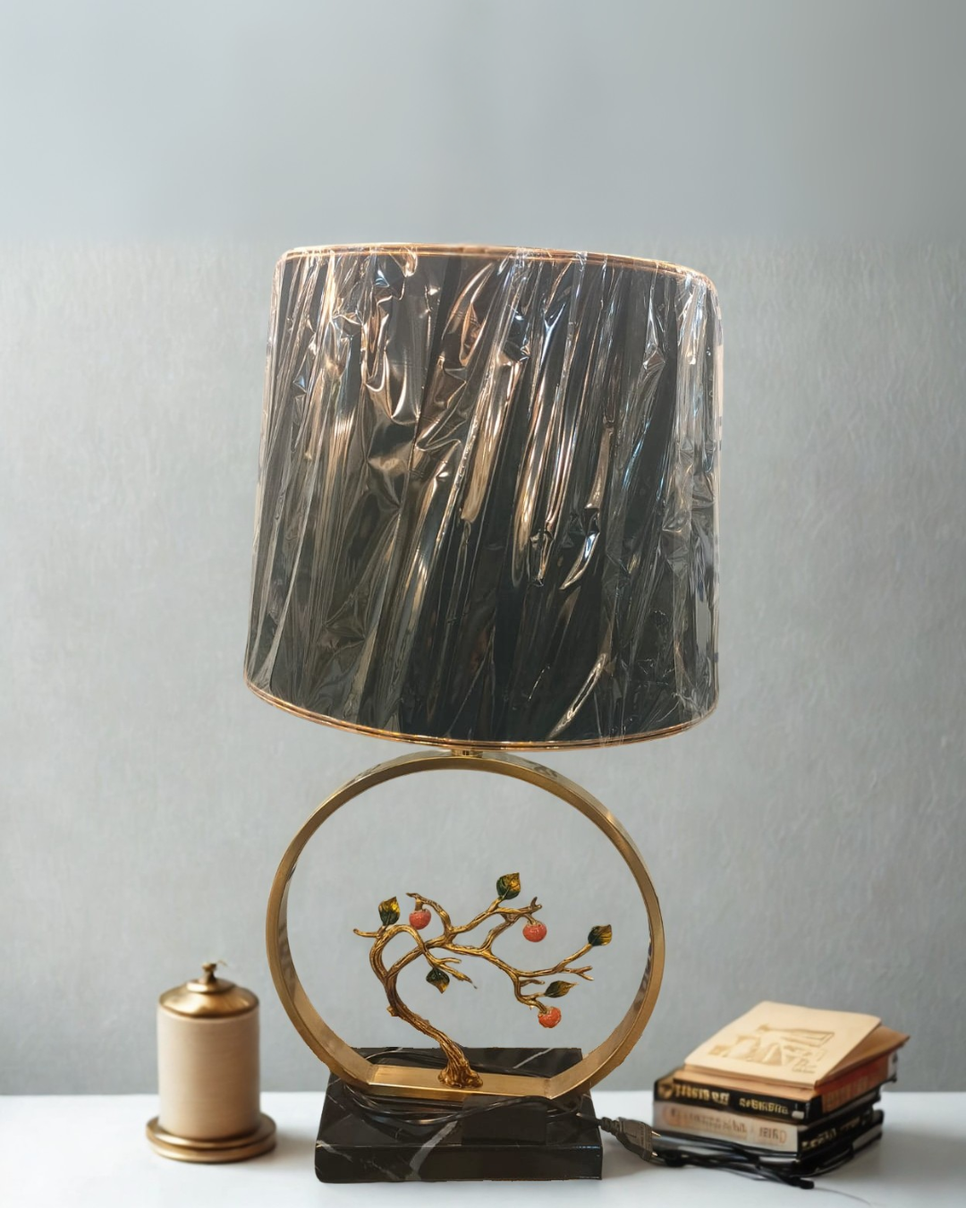 • Table lamp with a black drum shade, golden ring framing a bonsai tree sculpture, and a marble-effect base.