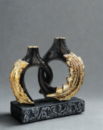 Celebrate everlasting connection with this exquisite sculpture. Two sleek black forms, reminiscent of elegant vases, are beautifully intertwined, adorned with meticulously crafted golden feathers. Resting on a richly textured base, this piece symbolizes harmony, luxury, and the beauty of shared journeys.