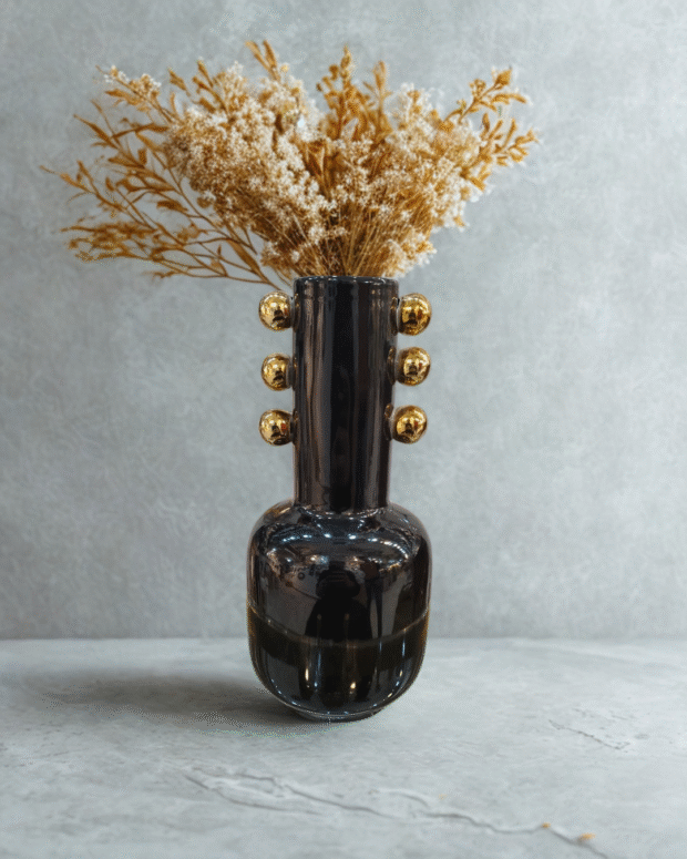 - Unique guitar-neck inspired black ceramic vase with golden accents.