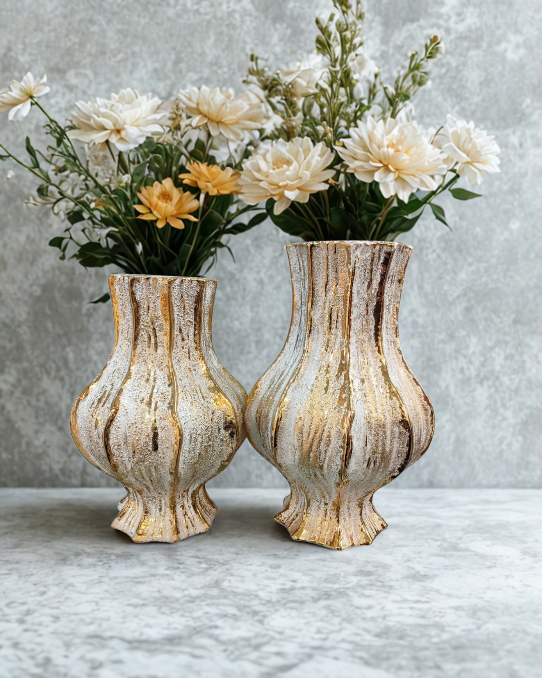 Embrace timeless charm with this exquisite pair of textured vases. Each features a beautifully distressed finish in warm off-white, intricately brushed with shimmering gold accents that catch the light. Their classic fluted shape and rustic elegance make them perfect for displaying lush florals, adding a touch of vintage luxury and warmth to any setting.