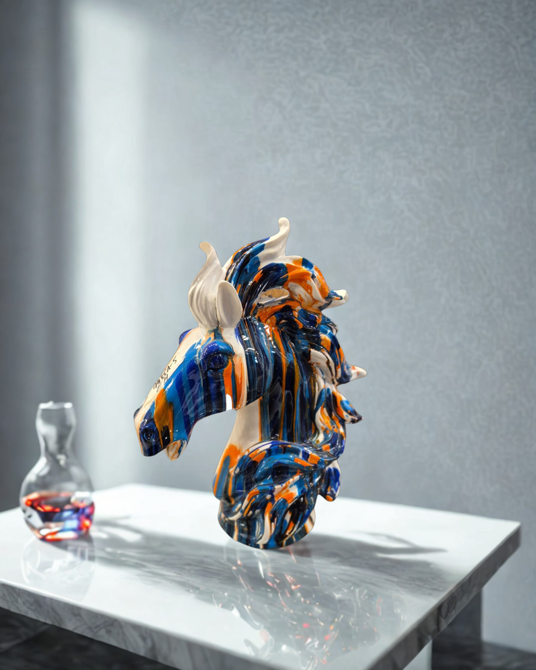 A masterpiece of motion and color, this equine bust captures the noble profile of a horse through a stunning lens of abstract fluid art. Intricate swirls of deep navy, vibrant orange, and crisp cream dance across the sculpture’s surface, highlighted by a brilliant high-gloss finish. This sophisticated piece serves as a captivating focal point for a marble mantle, executive desk, or minimalist entryway.