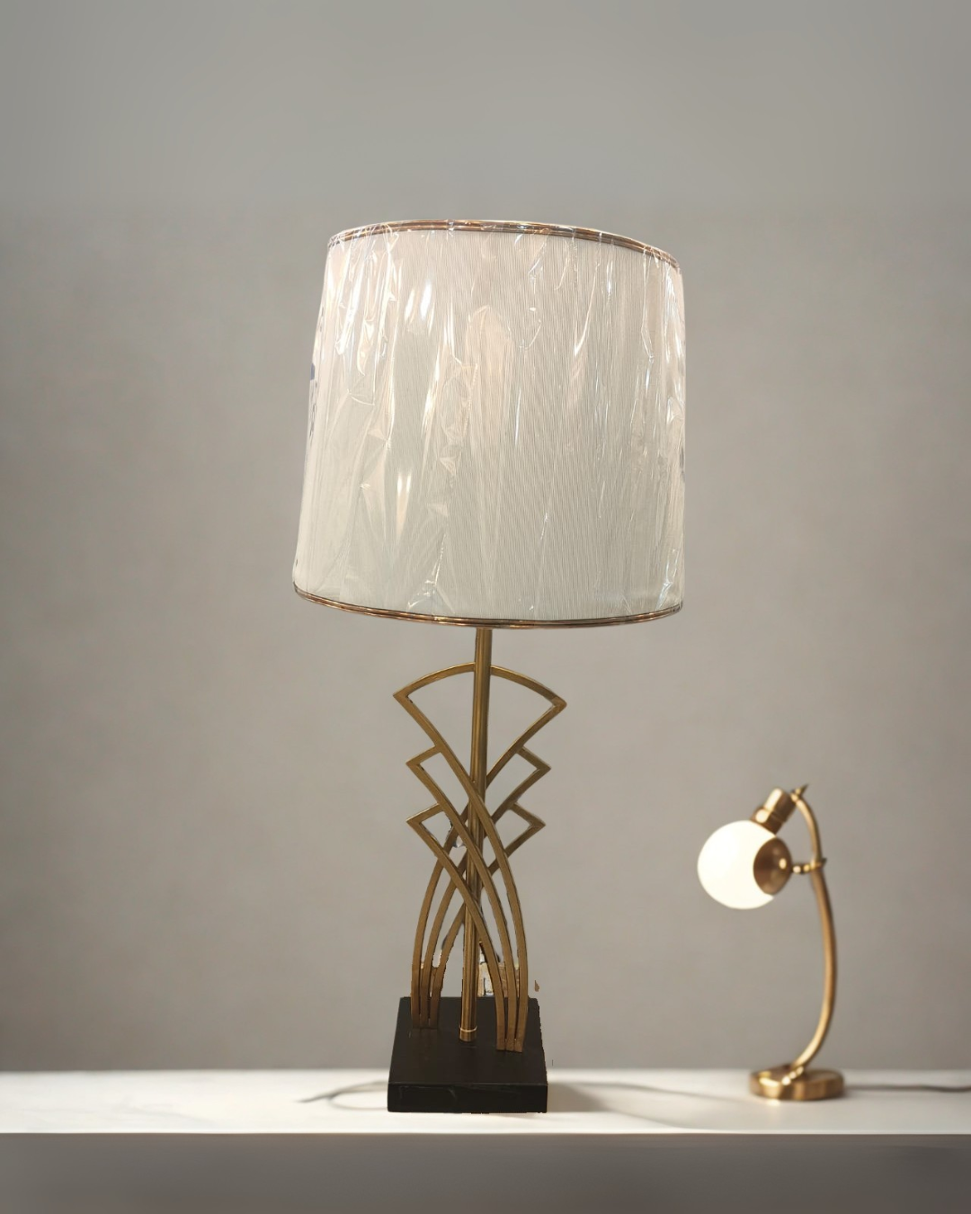 - Table lamp with an intricate golden geometric Art Deco base on a black pedestal, topped with a white drum shade.