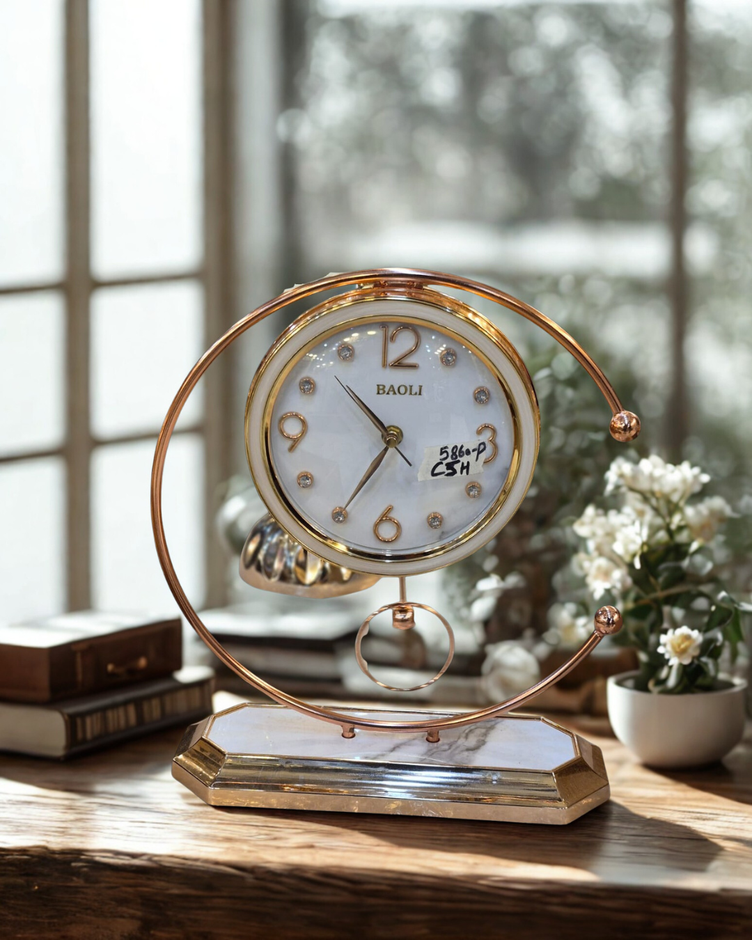 A masterpiece of balance and light. This BAOLI timepiece features a suspended “Halo” frame and a faux-marble plinth, creating a sense of airy luxury. The pearl-white dial is accented with rose gold numerals and shimmering crystal indices, making it a perfect centerpiece for a vanity, mantle, or executive desk.