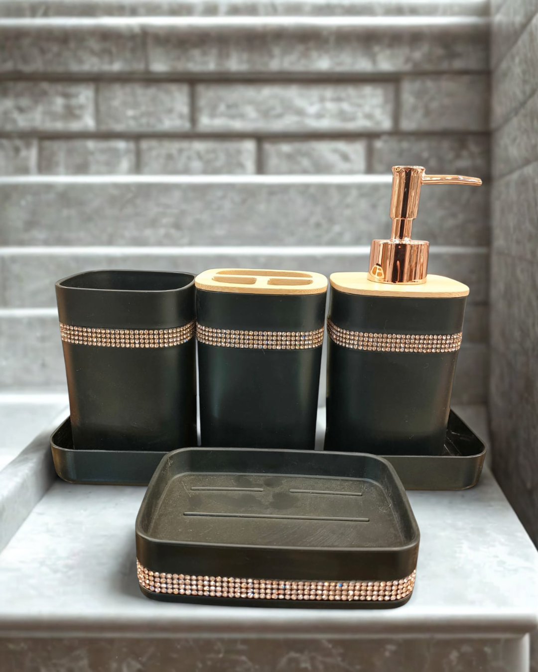 Make a powerful statement with our Bathroom Accessory Set, masterfully blending modern boldness with warm, natural elements. The rich matte black body contrasts dramatically with natural bamboo tops and is elevated by dazzling bands of rose gold rhinestones. This set offers a perfect balance of organic warmth and opulent style.
