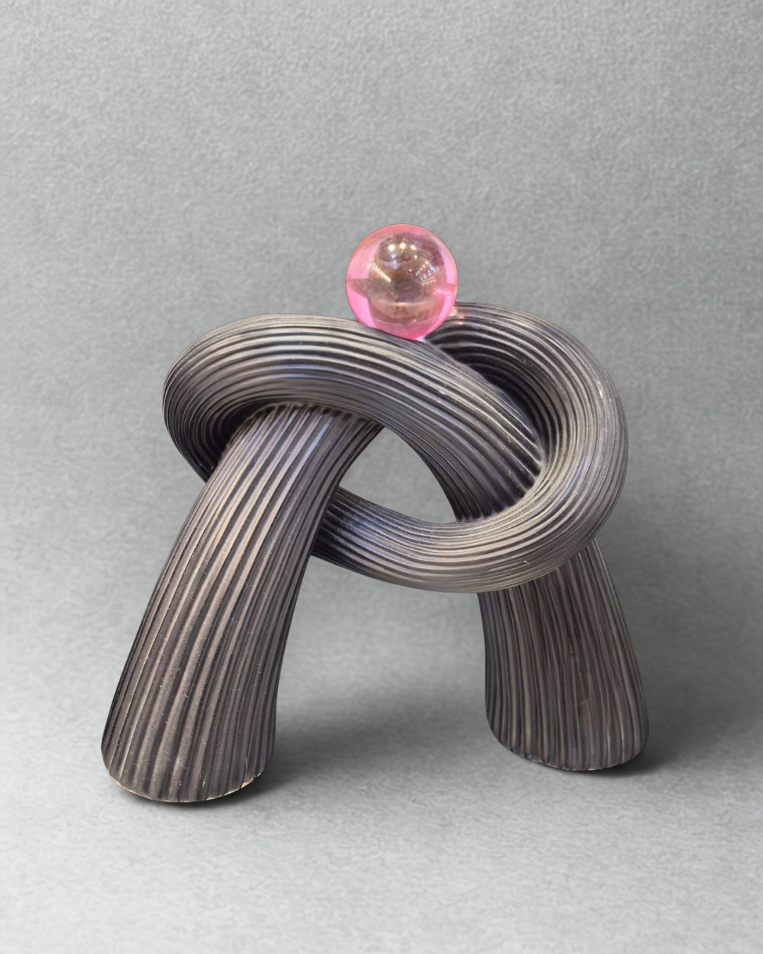 This sophisticated abstract statue showcases a dynamic, interlocking “knot” design that creates a sense of strength and continuity. The piece is finished in a deep charcoal matte with intricate vertical ribbing that enhances its architectural silhouette.