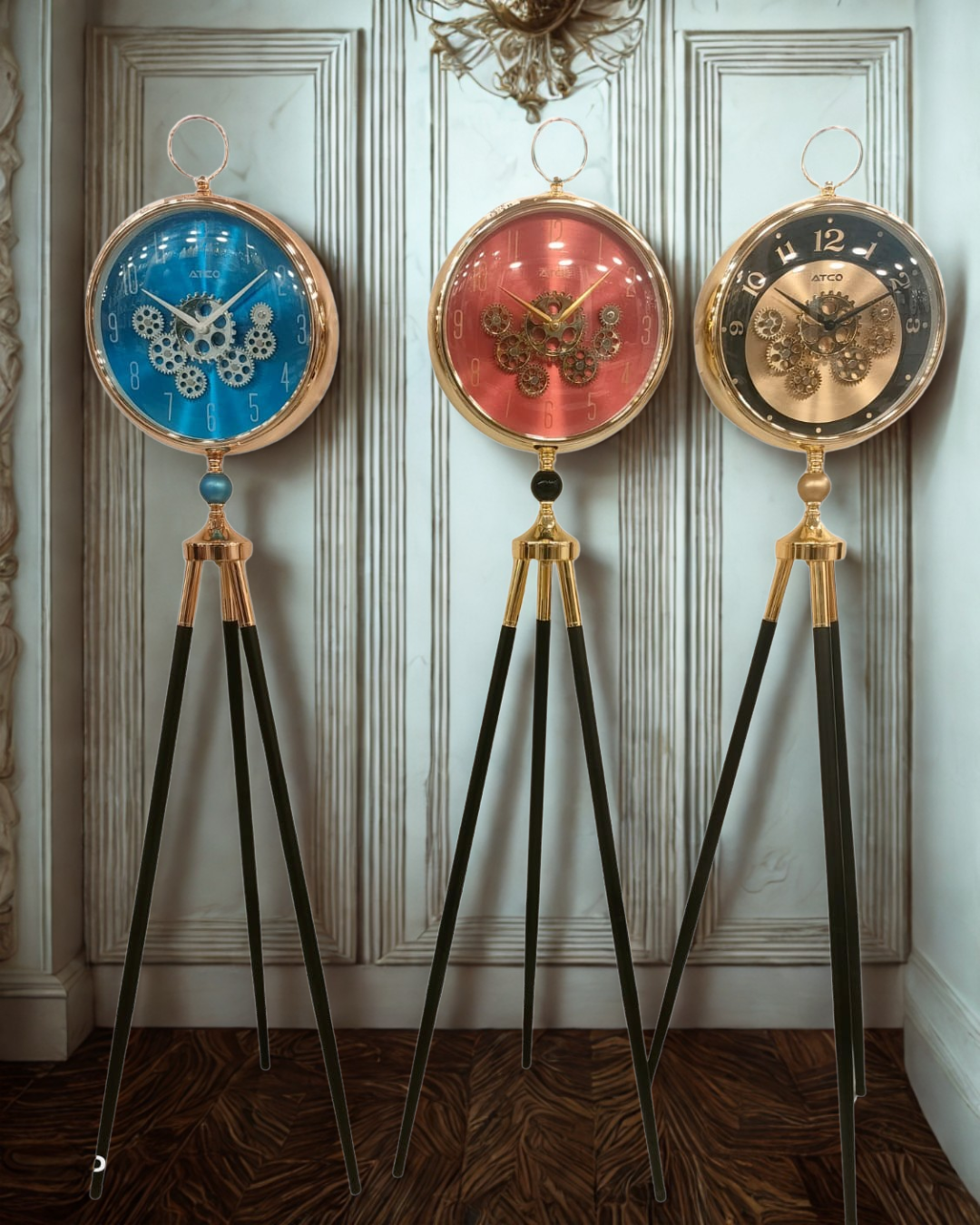 Elevate your home decor with a splash of color and mechanical charm! This collection of Steampunk Tripod Floor Clocks features the iconic, elegant design with a bold, modern twist. Available in three stunning face colors—Electric Blue, Ruby Red, and Classic Gold/Black—these clocks are designed to be the vibrant centerpiece of any room.