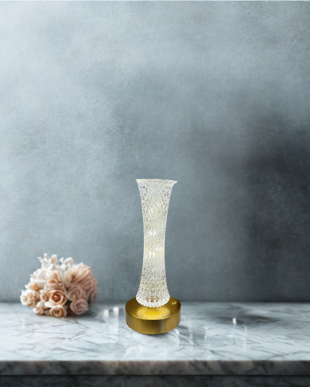 This exquisite table lamp features a slender, etched crystal body that beautifully diffuses light, paired with a sleek brushed gold base for a look that is both modern and regal. Whether it’s acting as a centerpiece on a marble vanity or adding a warm glow to your bedside, its intricate diamond-cut pattern ensures a dazzling display from every angle.