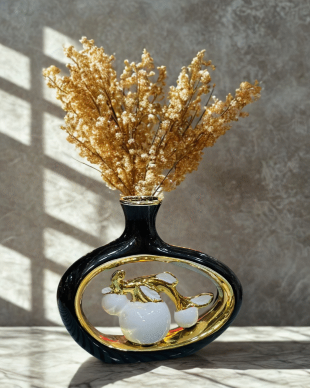 More than just a vase, it’s a framed piece of art! This striking black ceramic vase features a captivating golden branch sculpture with delicate white spheres, all set within a clear, gold-rimmed window. The interplay of light and shadow highlights its unique contours. Paired with natural dried botanicals, it creates a sophisticated and contemporary statement for any desk, console, or shelf. Where would you display this masterpiece?