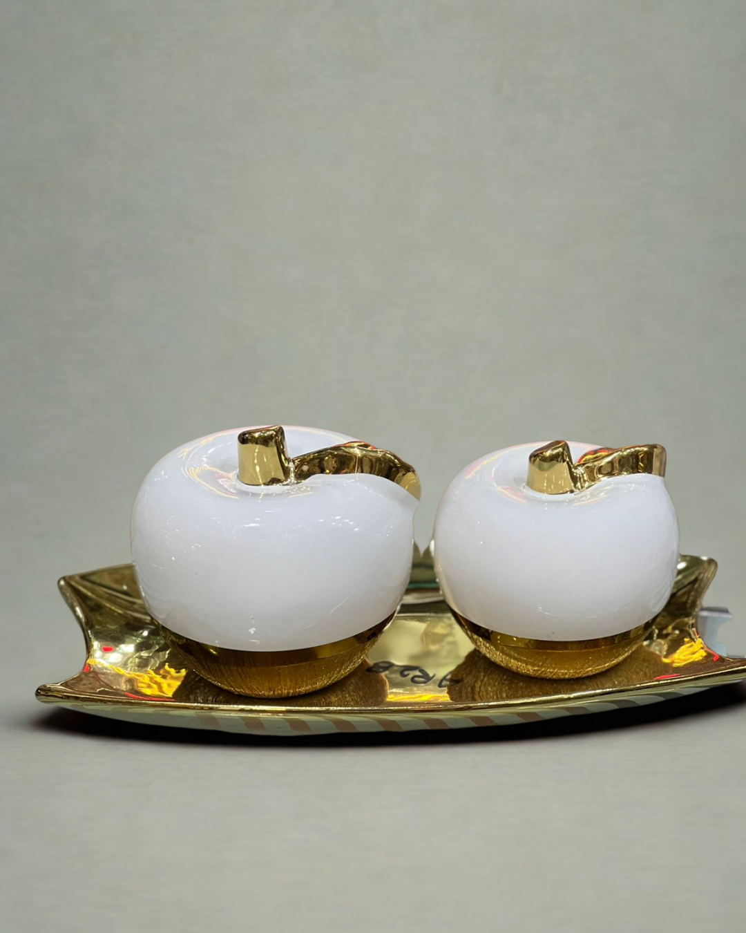 Add a touch of sweet sophistication to your space! ✨ This charming set features two pristine white apple-shaped decor pieces, each crowned with a radiant gold stem and base. They rest perfectly on a gleaming gold-leaf tray, creating an opulent and inviting display. Perfect for a coffee table, console, or vanity, bringing a blend of playful charm and luxurious elegance to any room. What a delightful way to decorate!