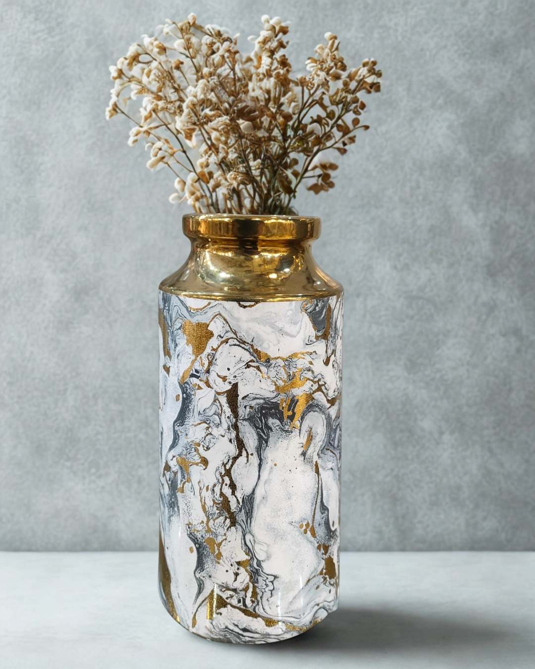 A truly glamorous and modern decorative vase featuring a robust cylindrical shape and a luxurious, artistic finish. The body showcases a dramatic fluid marbleized pattern in high-contrast white and black/gray swirls, lavishly interspersed with shimmering metallic gold accents. The piece is crowned with a wide, flared, and highly reflective polished gold neck, providing a touch of Art Deco-inspired opulence. Perfect for displaying dried or fresh botanicals, this vase serves as a bold, sophisticated centerpiece or accent for Modern Glam, Contemporary, and Luxury Transitional interiors.