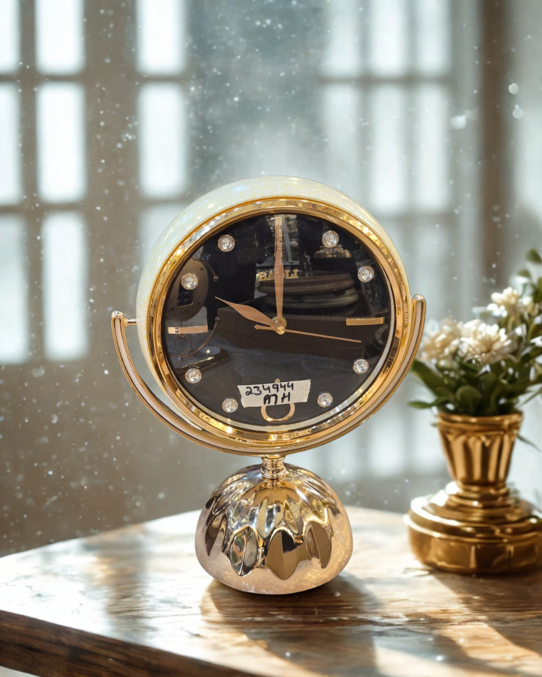 Time doesn’t just pass; it revolves. Inspired by celestial movement, the Midnight Orbit clock features a rotating golden axis and a deep-space black dial. Encrusted with brilliant-cut crystals that catch the light like distant stars, this isn’t just a clock—it’s a conversation piece for the curated home.