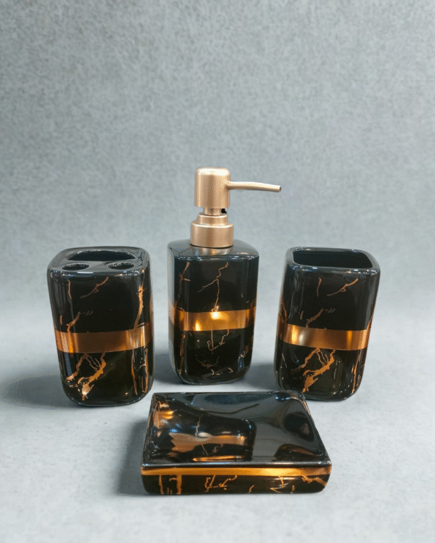 Elevate your daily routine with a touch of opulent sophistication! ✨ This stunning 4-piece bathroom vanity set features a sleek black base with a gorgeous golden/copper marble veining effect, complemented by lustrous rose gold accents. Including a soap dispenser, toothbrush holder, tumblers, and soap dish, it’s perfect for adding modern luxury and cohesive elegance to your master bathroom or guest powder room.