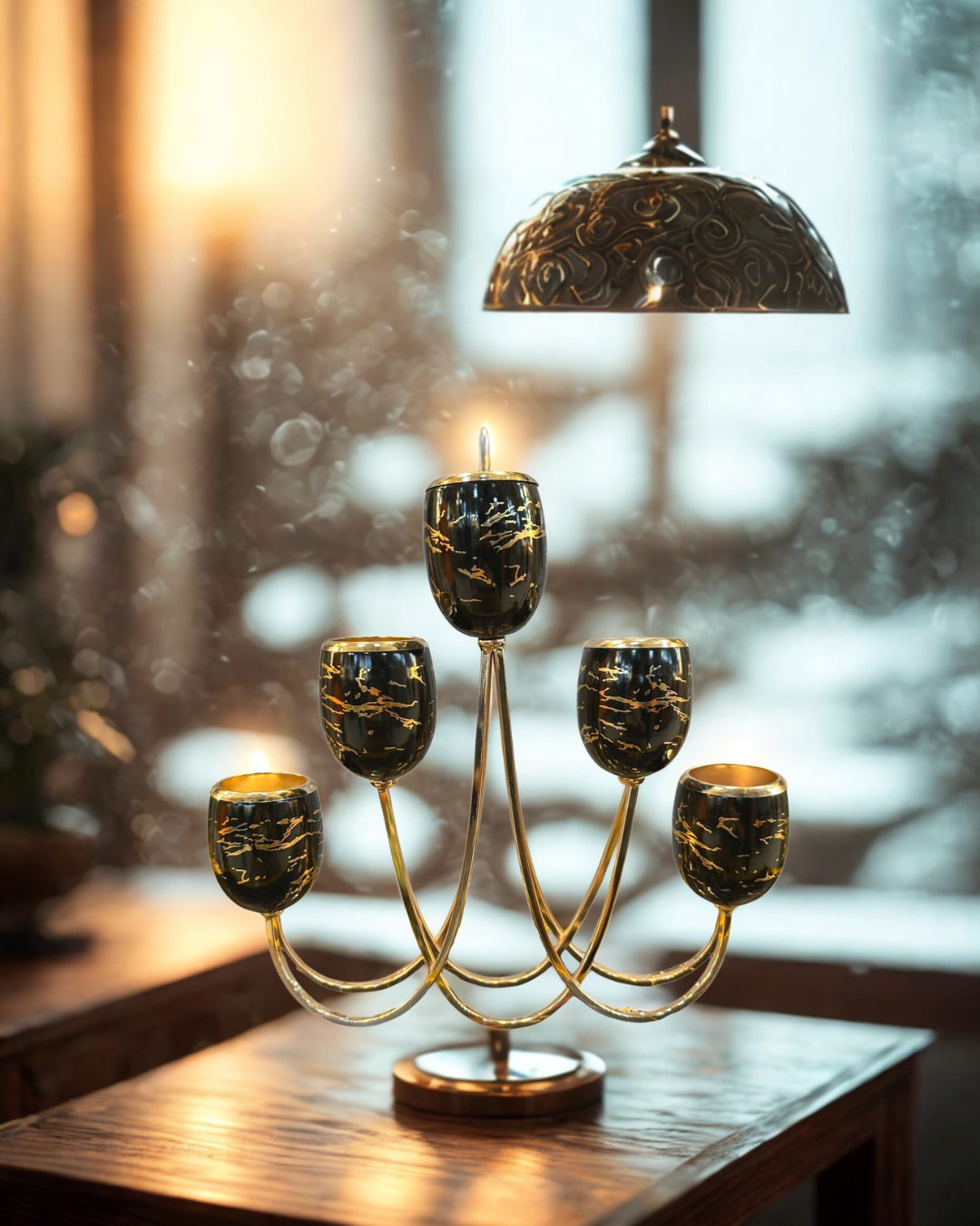 Midnight Aurora” 5-Cup Gold & Black Marbleized Candelabra