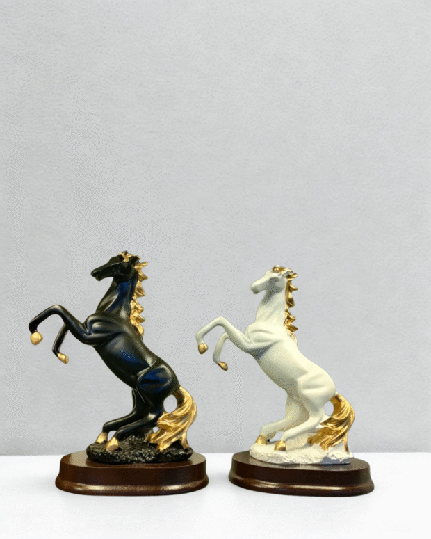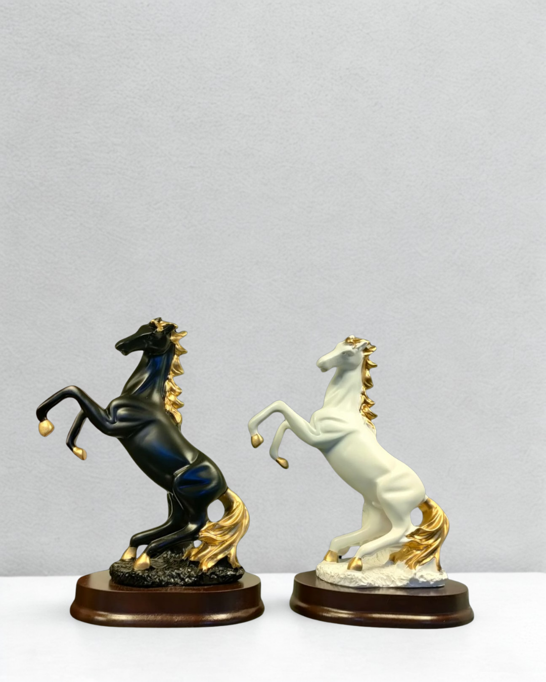 Command attention with this magnificent duo! ✨ These majestic rearing horse sculptures exude power, grace, and noble spirit. Each piece features a beautifully sculpted horse in classic black or pristine white, accented with striking gold manes, tails, and hooves. Mounted on elegant wooden bases, they are perfect for adding a touch of regal grandeur and dramatic sophistication to your executive office, library, or living room. Which powerful steed captures your imagination?