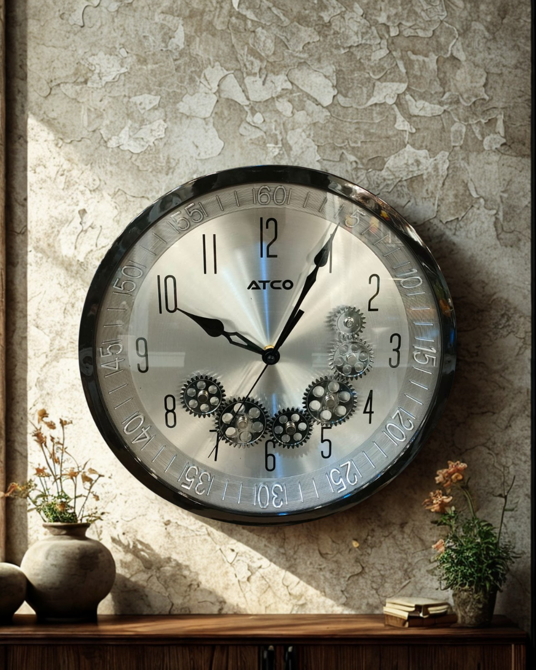 - Feature: Exposed, Decorative Silver and Dark Gear Mechanism