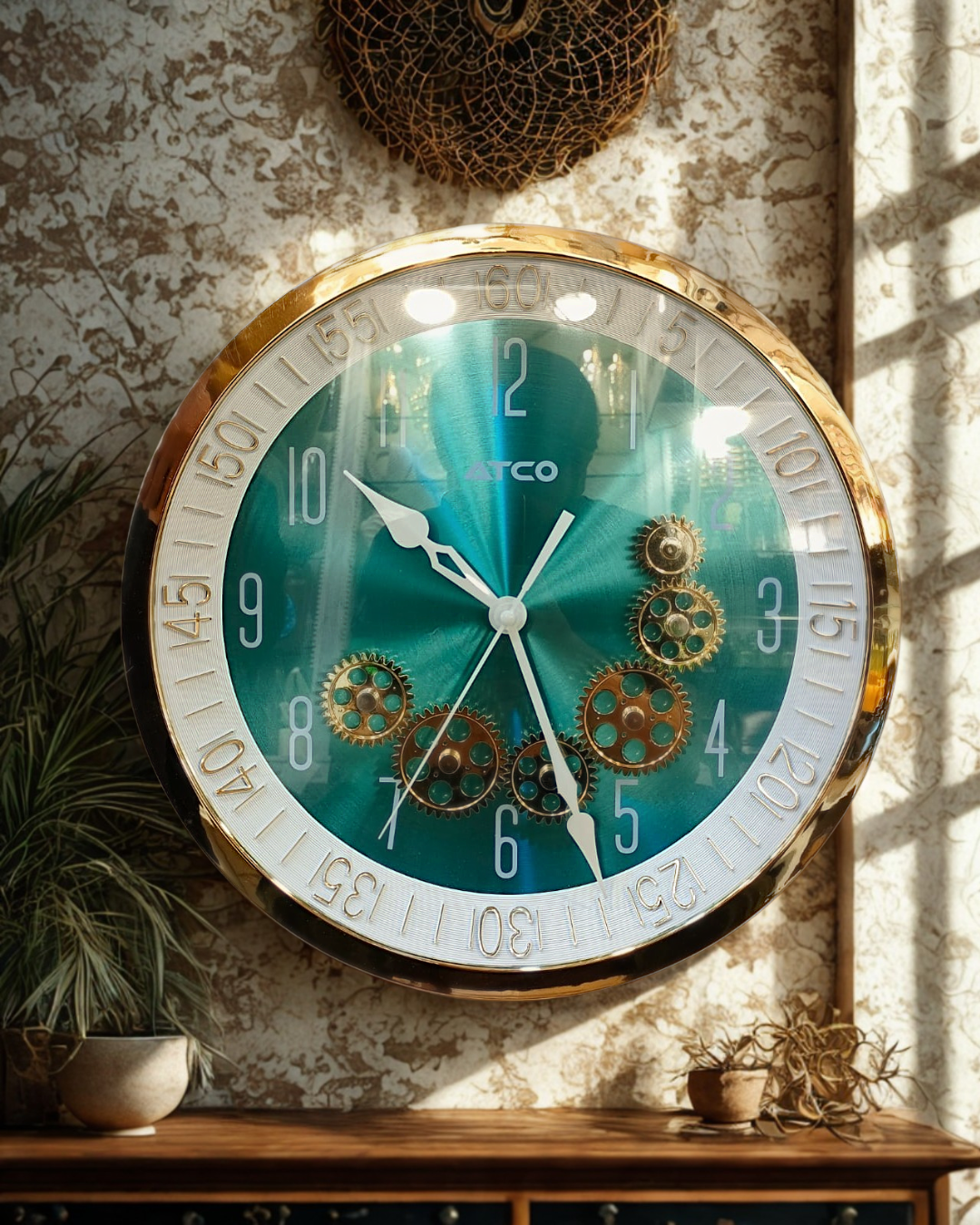 Make a bold statement with this exquisite Teal and Gold Wall Clock, a perfect fusion of vibrant color and sophisticated mechanical design. This clock is an instant focal point, designed to elevate any contemporary, luxury, or eclectic interior.