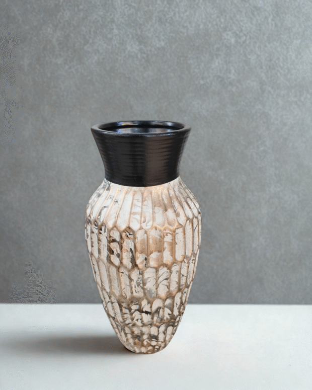 A highly textured and visually engaging decorative vase that contrasts geometric pattern with smooth finishes. The vase features a slightly flared, elongated body with a prominent honeycomb, cracked, or mosaic texture across the surface, finished in a blend of aged white and earthy beige/brown tones. The piece is crowned with a simple, contrasting smooth black collar and rim. This vase is perfect for adding depth, texture, and a global, Modern Rustic, or Bohemian flair to a console table, mantel, or bookshelf. It serves beautifully as a standalone sculptural piece or to hold simple dried arrangements.