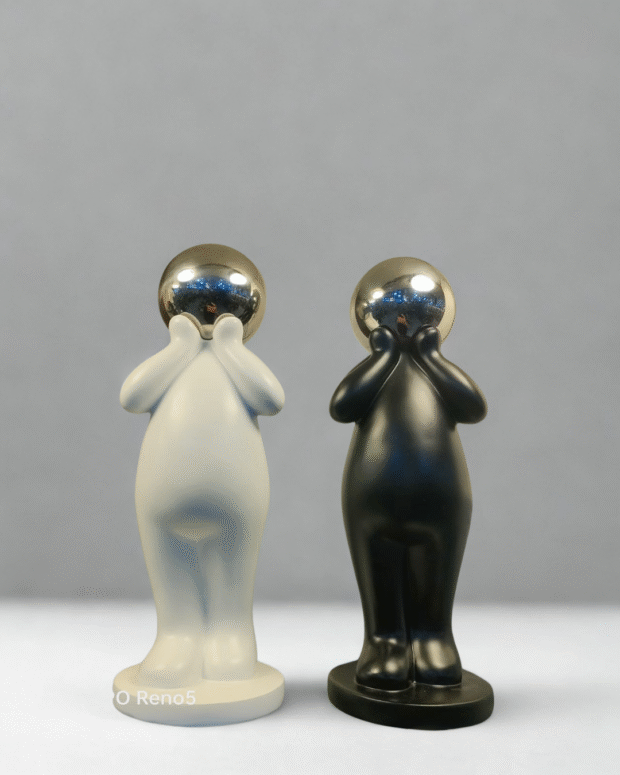 Discover depth and emotion in modern design! ✨ This captivating pair of minimalist art figures evokes a sense of introspection and human connection. Each sleek black and white form features a highly reflective silver head, creating an intriguing contrast and drawing the viewer into their expressive pose. Perfect for sparking conversation, these sculptural pieces bring a touch of contemporary art and emotional resonance to any desk, shelf, or console. What message do they convey to you?