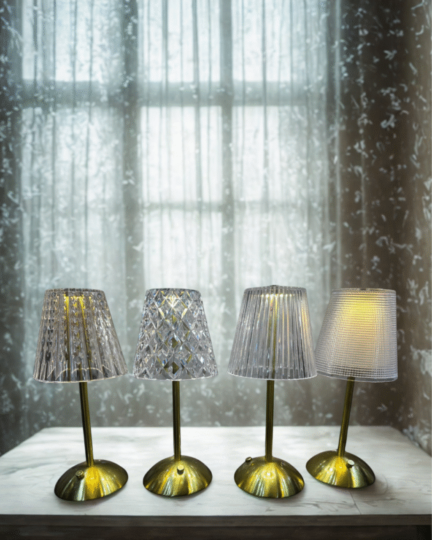 Light up your life, stylishly! ✨ This charming collection of portable mini lamps features classic gold bases and a variety of elegant textured shades – from ribbed to crosshatch to subtle frosted patterns. Each casts a warm, inviting glow, perfect for creating instant ambiance on a dinner table, bedside, patio, or cozy reading nook. Rechargeable and ready to illuminate your every moment, indoors or out! Which shade is your favorite?