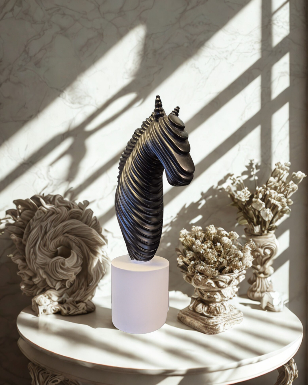 Perched atop a luminous, translucent pedestal, the piece appears to float, bridging the gap between heavy industrial texture and ethereal lightness. Its placement among classical marble elements and soft botanicals highlights its role as a modernist focal point that commands attention through form and repetition.