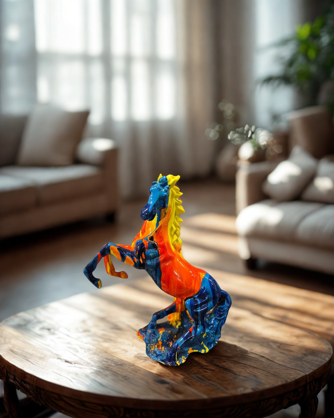 Add a burst of energy to your living space with this striking resin horse sculpture. Featuring a dynamic “drip-paint” technique in bold primary hues of cobalt blue, fiery orange, and electric yellow, this piece captures the spirit of untamed freedom. Each swirl of color is unique, making it a true one-of-a-kind center-piece for your coffee table or office desk.