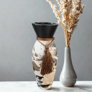 Tall Abstract Art Vase with Black Flared Neck & Tassel Accent / Modern Neutral Decorative Vessel